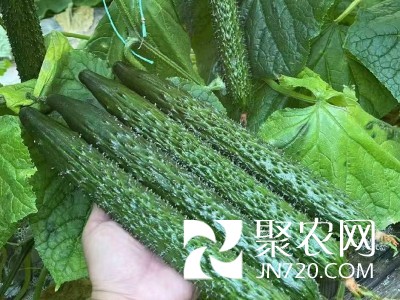 德瑞特9:該品種植株長(zhǎng)勢(shì)強(qiáng),龍頭好,葉片中等,黑綠,節(jié)間適中。主蔓結(jié)瓜,瓜碼密,連續(xù)結(jié)瓜能力強(qiáng),返頭能力強(qiáng)。腰瓜長(zhǎng)度為36厘米左右,短把、密刺、瓜頭飽滿,顏色黑油亮,無(wú)黃線,瓜條整齊順直,商品性好,總產(chǎn)量高。
